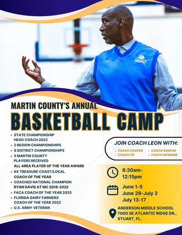 Camp presented by State Champion head coach John Leon, coaching staff, & varsity players. Campers focus on developing fundamental skills, opportunities for individual competitions, & play team games. For boys & girls from incoming 3rd graders to incoming 9th graders for the 2026-2027 school year. Camp runs from 8:30 am to 12: 15 pm Monday to Friday. If you have questions, please email us at martincountybasketball@gmail.com
